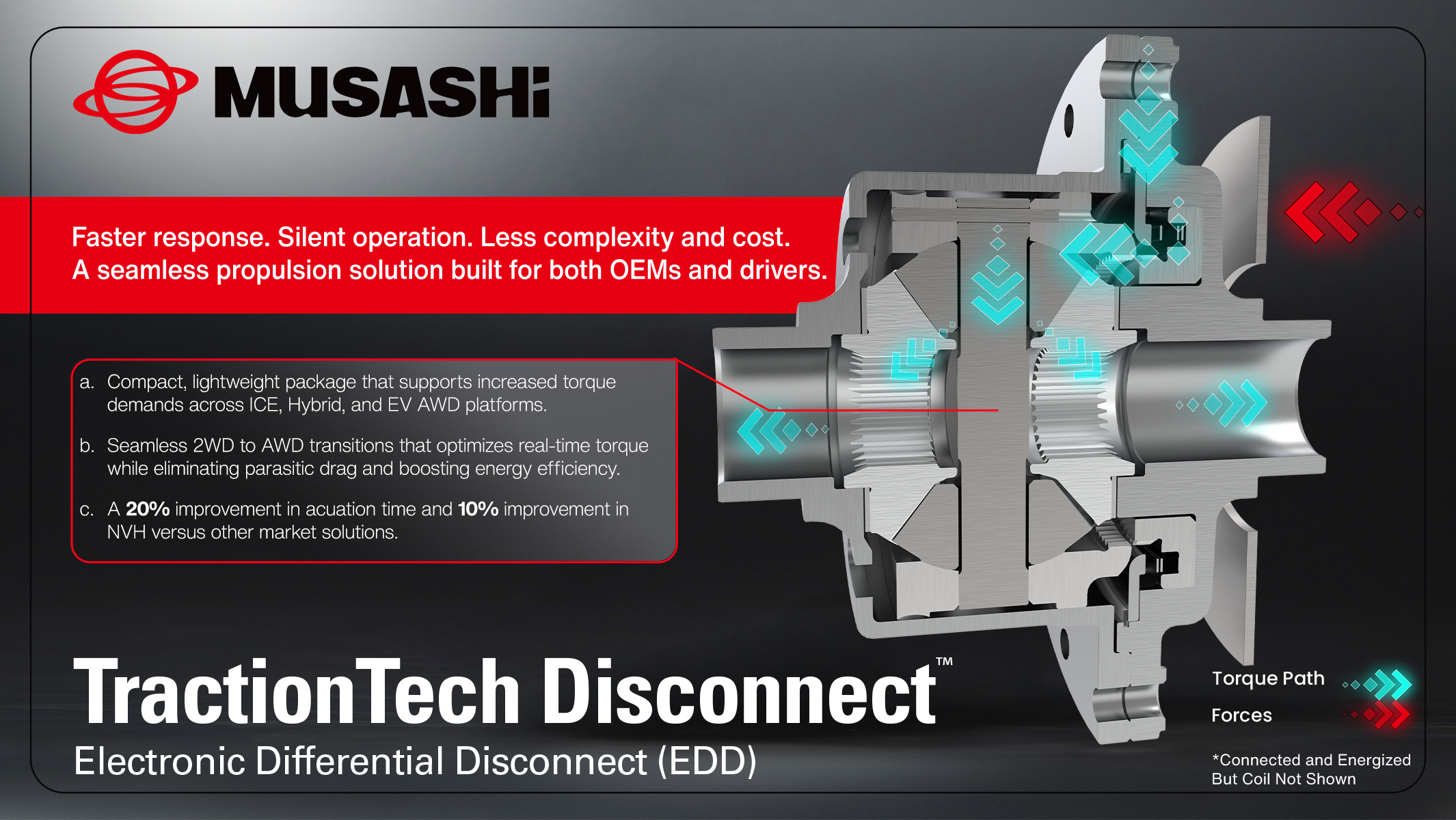 Next-Gen Differential Disconnect Musashi Americas is excited to announce a new approach to differential disconnect technology used in ICE, PHEV, HEV and BEV propulsion AWD